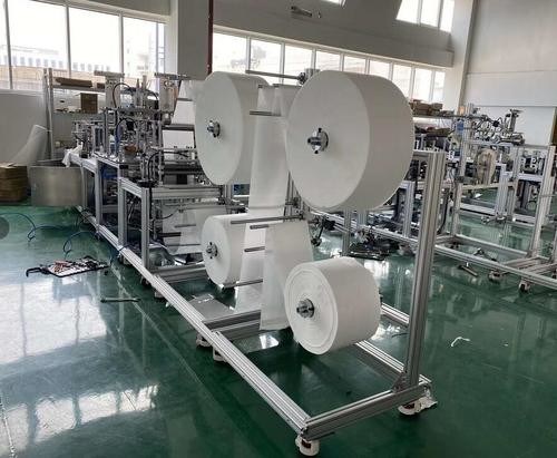 O equipamento é usado para produzir uma máscara não tecida descartável. O equipamento é composto principalmente da alimentação, dando forma, soldando, cortar, conexão e transferindo, soldadura polar da orelha, anular e empilhar, etc. além do que a alimentação manual, o processo do todo da matéria prima que alimenta ao empilhamento do produto acabado do corte de borda da inserção do reforço do nariz é operação totalmente automático. A máquina pode ser combinada por um soldador da orelha do dois-polo da tração da tração uma ou uma para cumprir exigências diferentes da capacidade de produção.